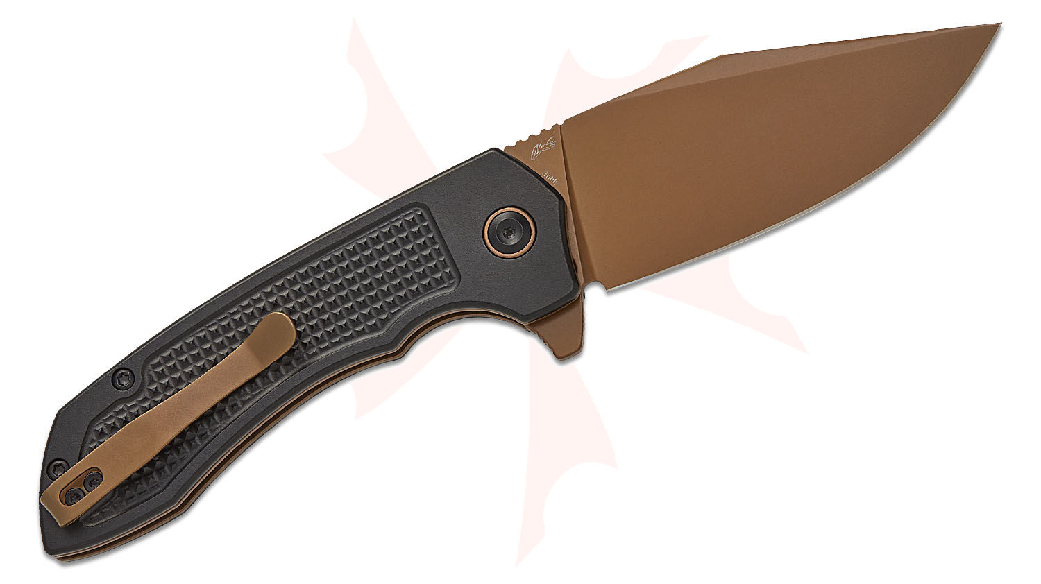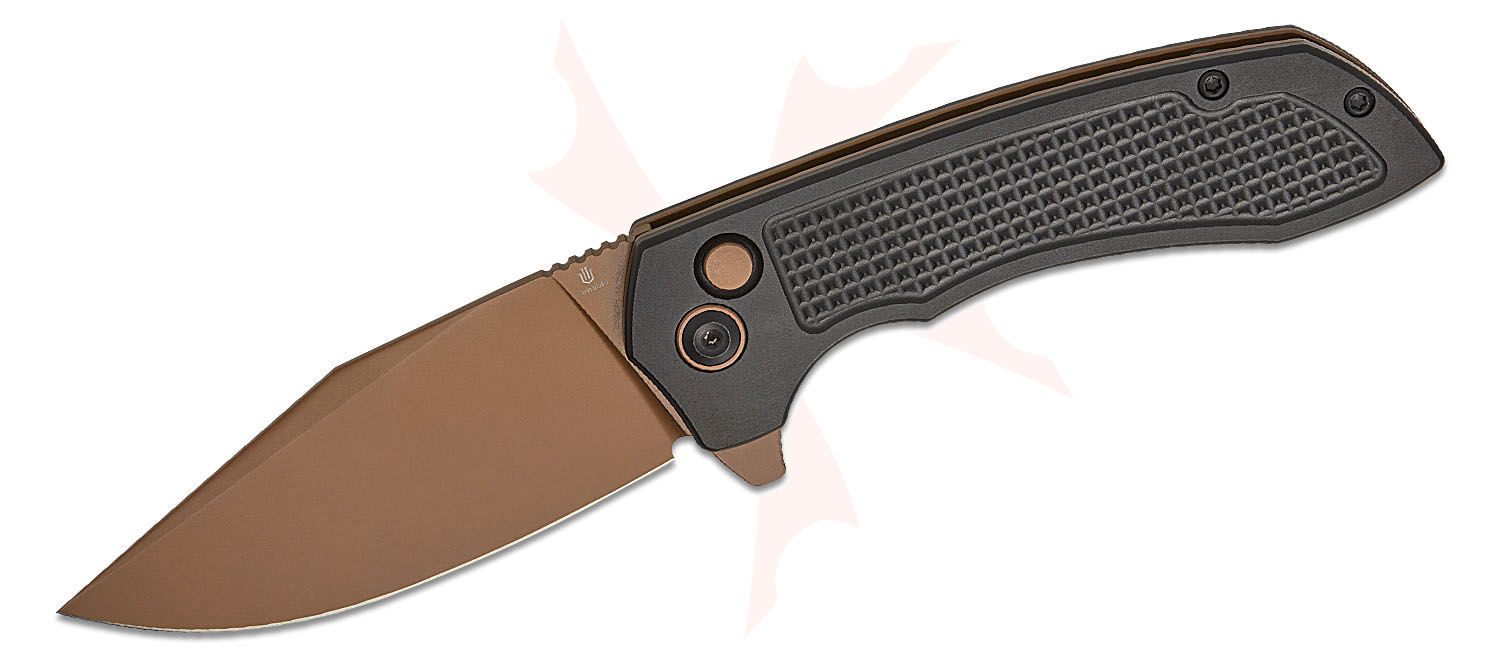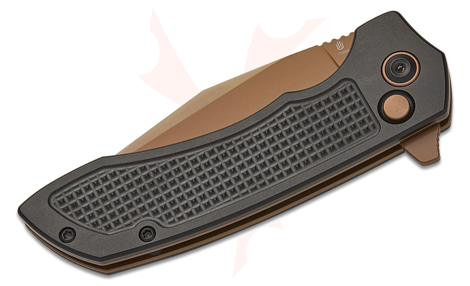 Tenable Knives Entity Button Lock Flipper Knife 3.52" 14C28N Rose Gold Clip Point Blade, Black Checkered Aluminum Handles - B1036F1