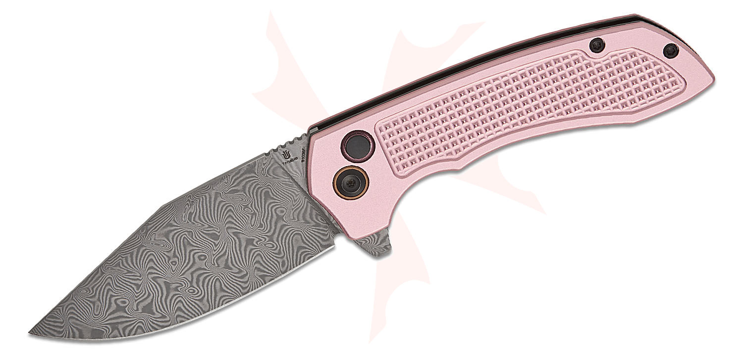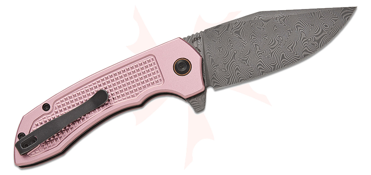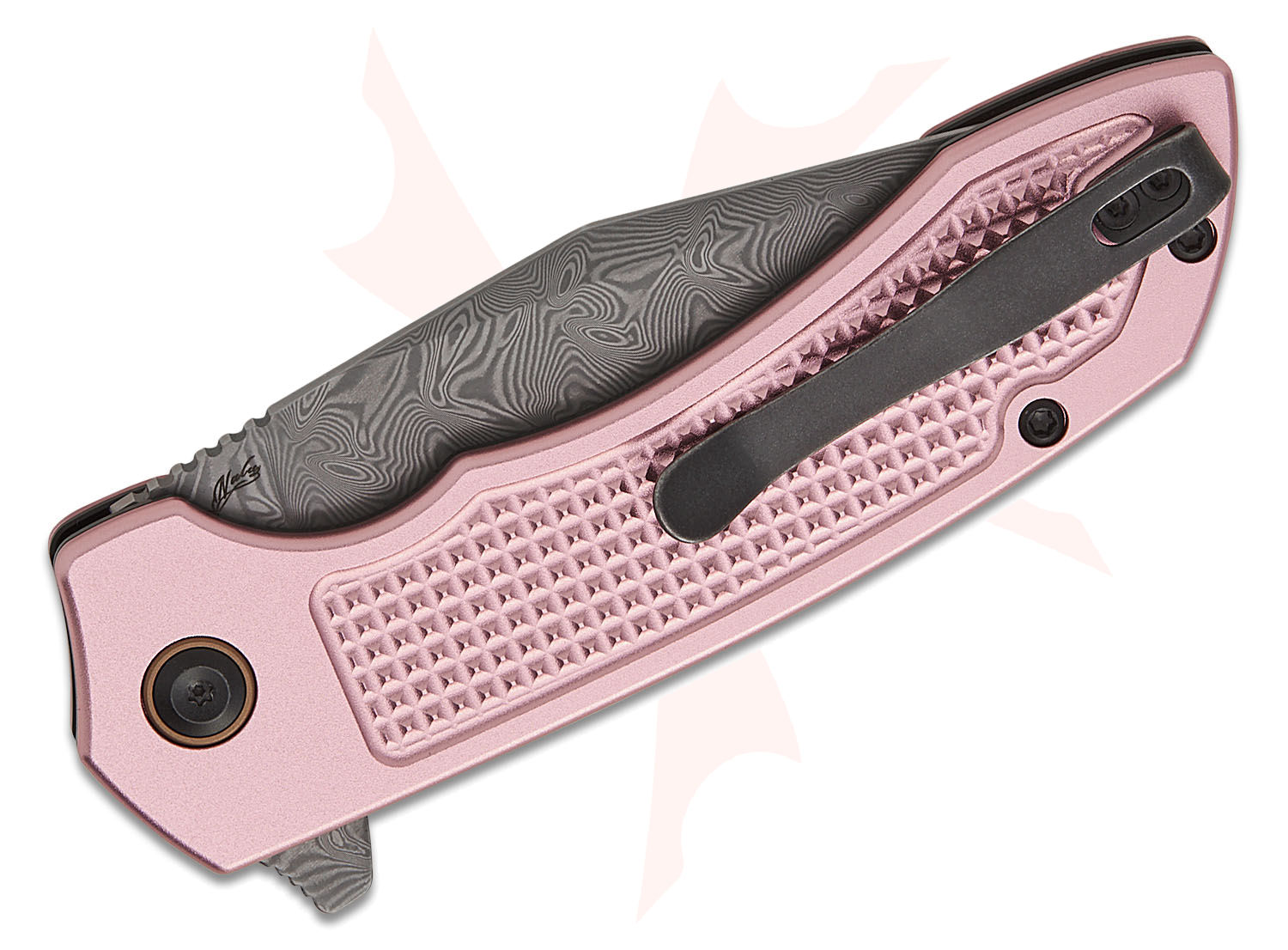 Tenable Knives Entity Button Lock Flipper Knife 3.52" 14C28N Damascus Clip Point Blade, Rose Gold Checkered Aluminum Handles - B1036F4