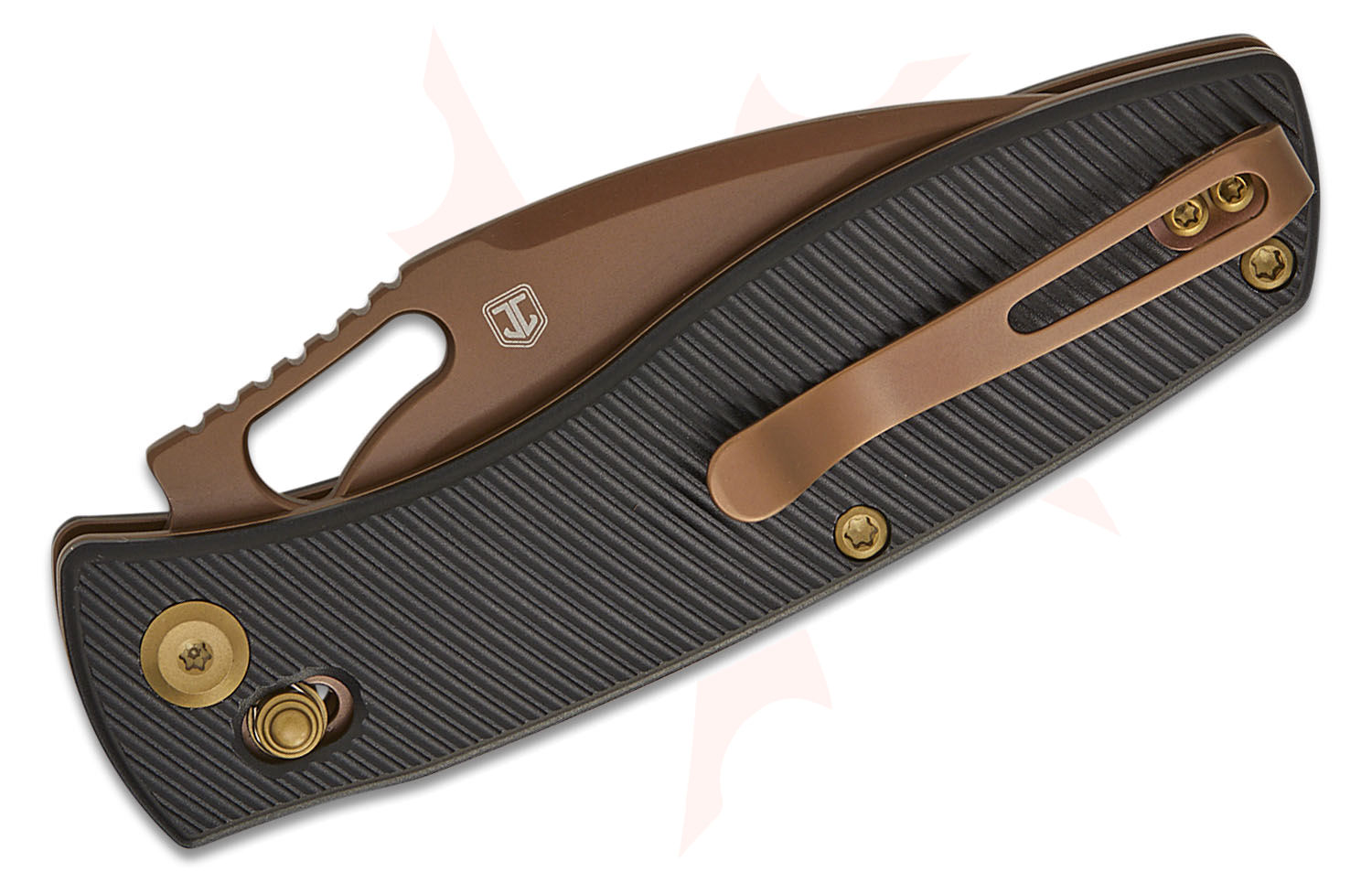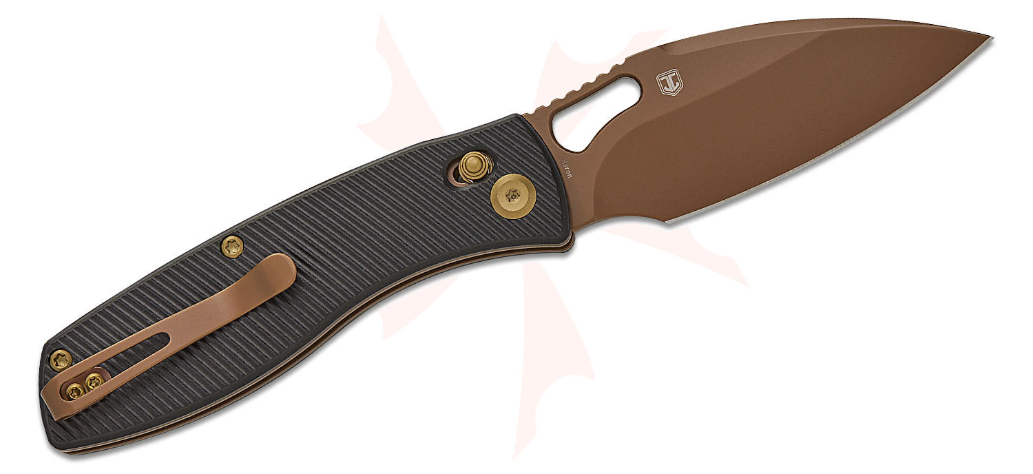 Tenable Knives Heron Crossbar Lock Folding Knife 3.13" Nitro-V Rose Gold Leaf Blade, Black Milled Aluminum Handles - B2124V2