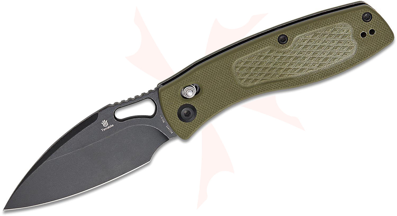 Tenable Knives Heron Crossbar Lock Folding Knife 3.13" Nitro-V Black Stonewashed Leaf Blade, Olive Green G10 Handle with Diamond Pattern - B2124V5