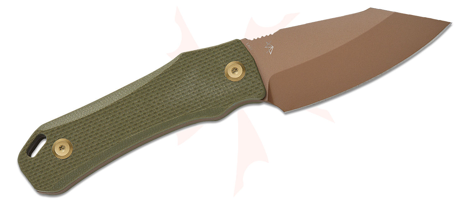 Tenable Knives Loki Fixed Blade Knife 2.99" D2 Rose Gold Coated Wharncliffe Blade, Olive Green G10 Handles, Kydex Sheath - G1058A3