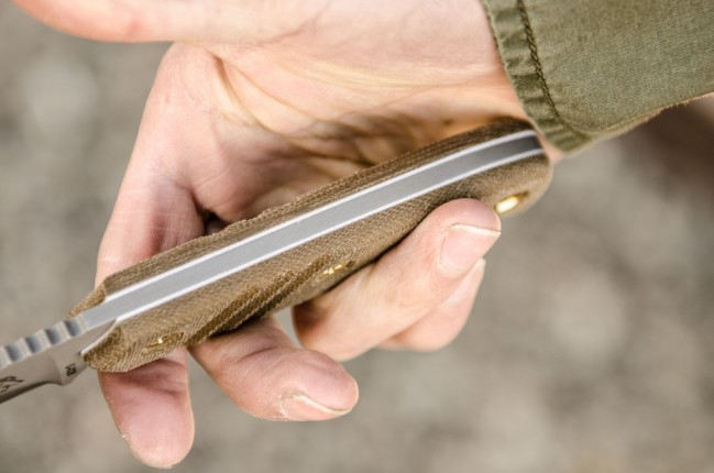 Unlike TOPS' other models in the 4 to 4.5 inch range, this one is 0.16” thick. That thickness along with a full flat grind gives it strength over 0.125” blades, but allows it to maintain superb cutting capabilities since it's slightly thinner than 0.19”. TOPS' professional heat treat gives a long lasting edge that is easy to re-sharpen once it is eventually needed. The jimping on the spine and along the finger guard is ideal for a solid grip in hard use or slippery conditions. Due to the thinner blade, it gives you better precision and greater range from making delicate cuts to cutting thick branches with ease. These same qualities make the BAJA 4.5 great for food prep as well.