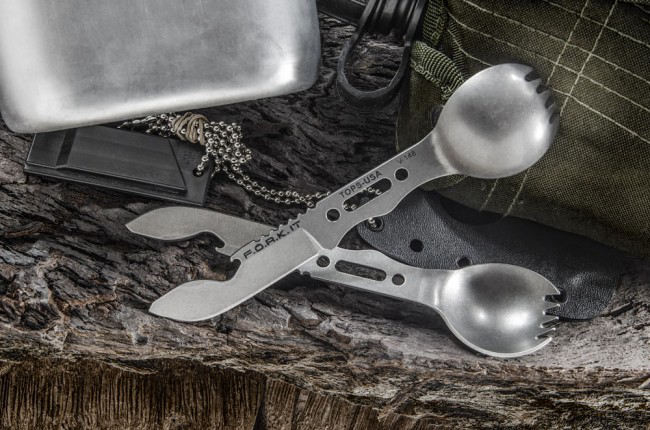 TOPS Knives FORK It Spork Multi-Tool Knife, Stonewash, Kydex Sheath - FORK-01
