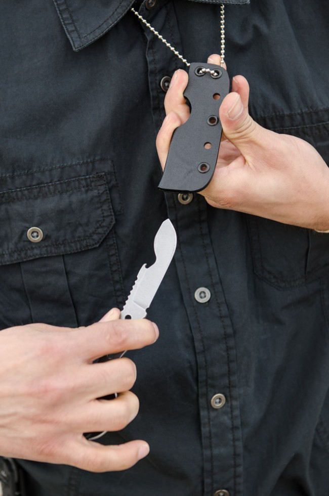 The 1095 high carbon blade is designed to complete most small chores easily from preparing food to cutting rope or preparing tinder for a fire. An important aspect of survival regardless of the situation is to have some "creature comforts". Having a civilized utensil available when it comes time to eat can make a bad situation seem a little more comfortable, and that can give a morale boost. The FORK It also has a bottle opener that comes in handy when drinking a fancy brew or imported soda, which can make this a staple for weekend camping trips and backyard barbecues. The Kydex neck sheath is small and lightweight giving access to the bottle opener without removing the knife and providing a safe handle for the spork.