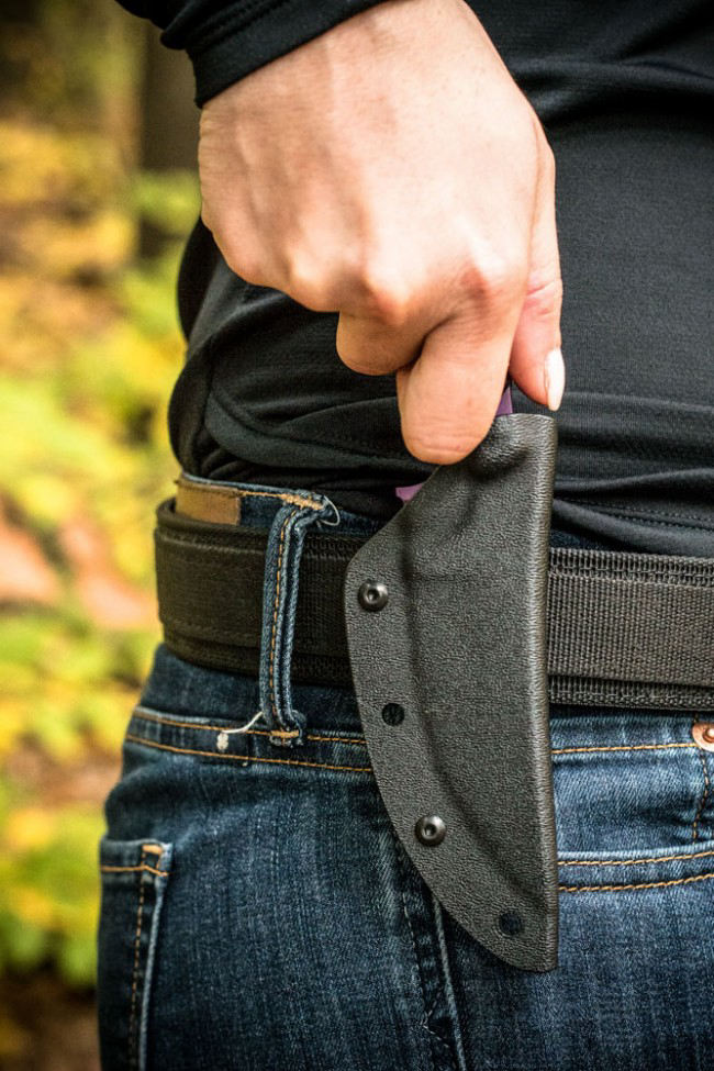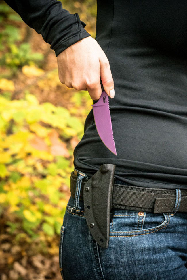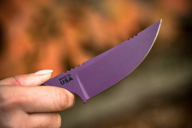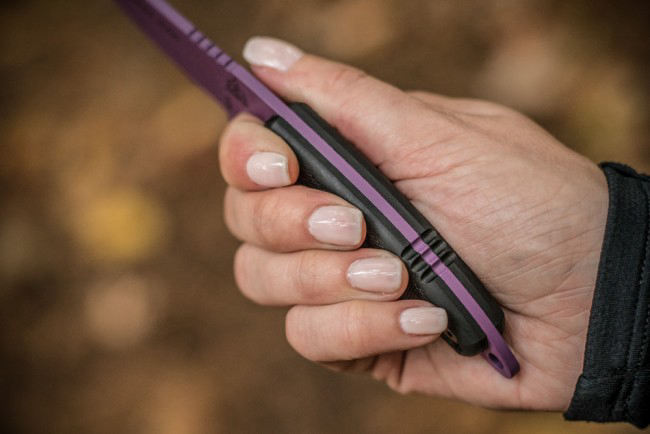 The contour of the cutting blade, combined with finger tread, enables both small and delicate chores to be completed with relative ease. Sleek handle ergonomics make long activities much easier to complete. The Lioness Elite includes a black Kydex sheath with a rotatable clip that makes vertical or horizontal carry easily possible depending on the situation. The dark purple color showcases the strength of the Lioness Elite.