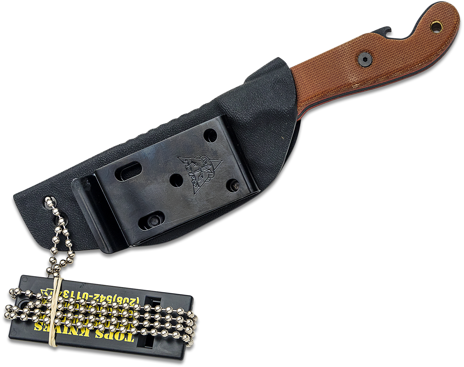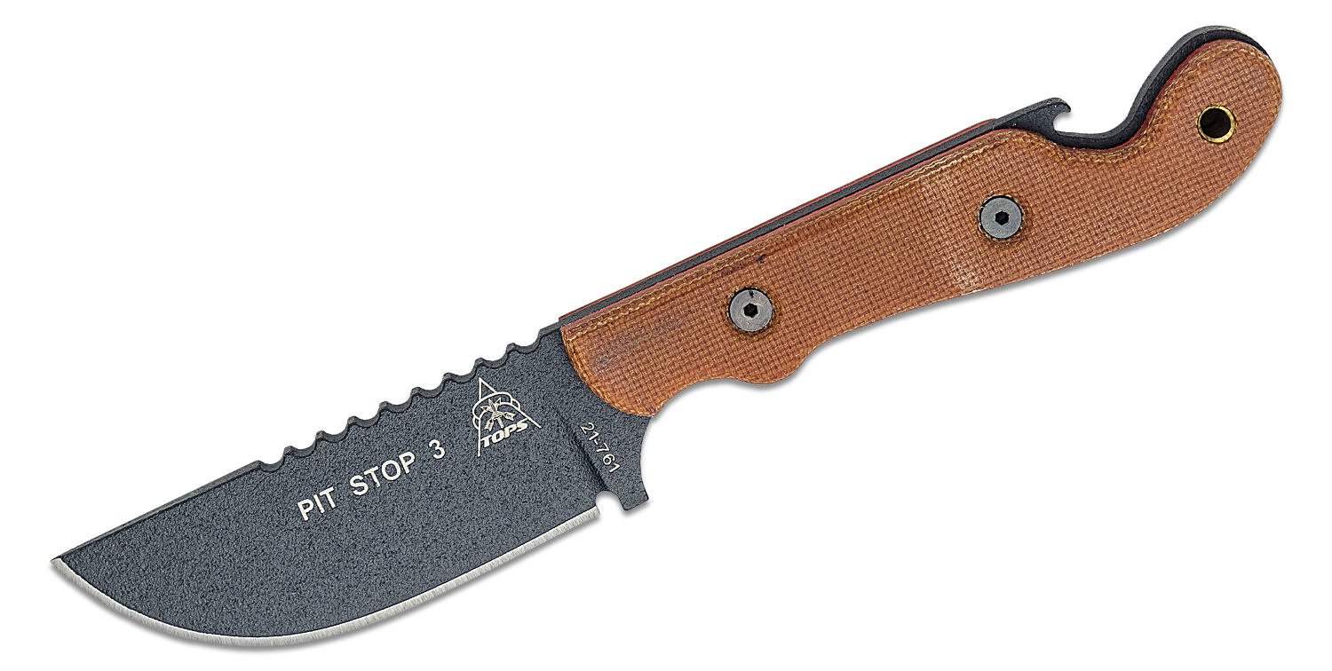 TOPS Knives Pit Stop 3 Fixed Blade Knife 3" 1095 Black Drop Point, Tan Micarta Handles, Kydex Sheath - PSK-01