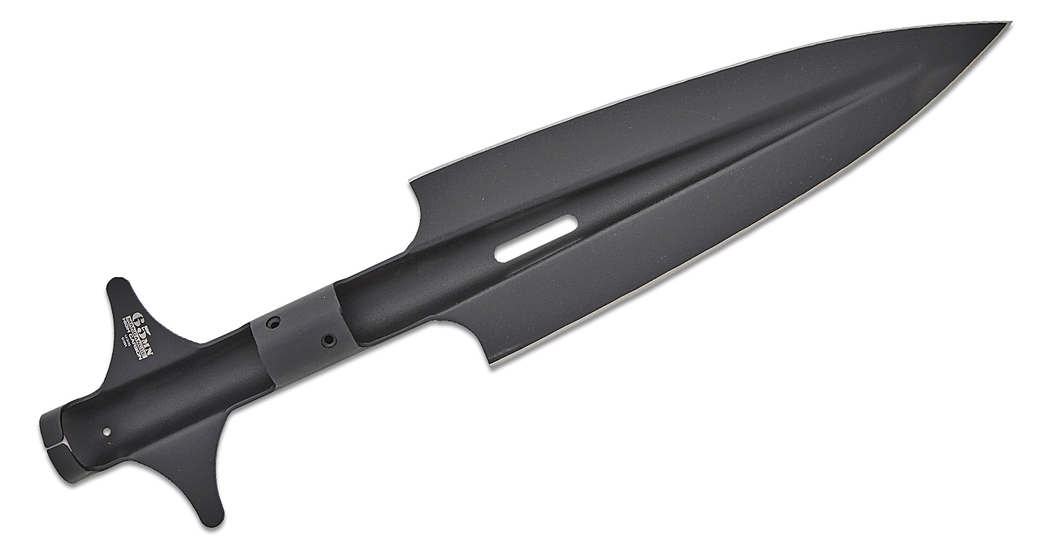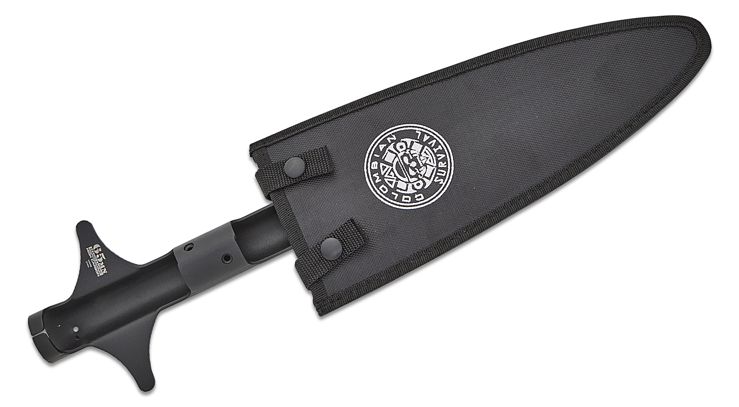 The Colombian Colossal Spearhead makes a strong impression on its own, but when mounted on a wooden shaft, it becomes an even more formidable weapon. Crafted from 65Mn high carbon steel and coated in black oxide, this spearhead boasts a thickness of 0.14 and a 54 HRC rating. It can easily be mounted on a standard 1.125" shaft, readily available at home improvement stores. Measuring a massive 11.65" overall, this spearhead includes a protective nylon belt sheath with double snap strap closures.