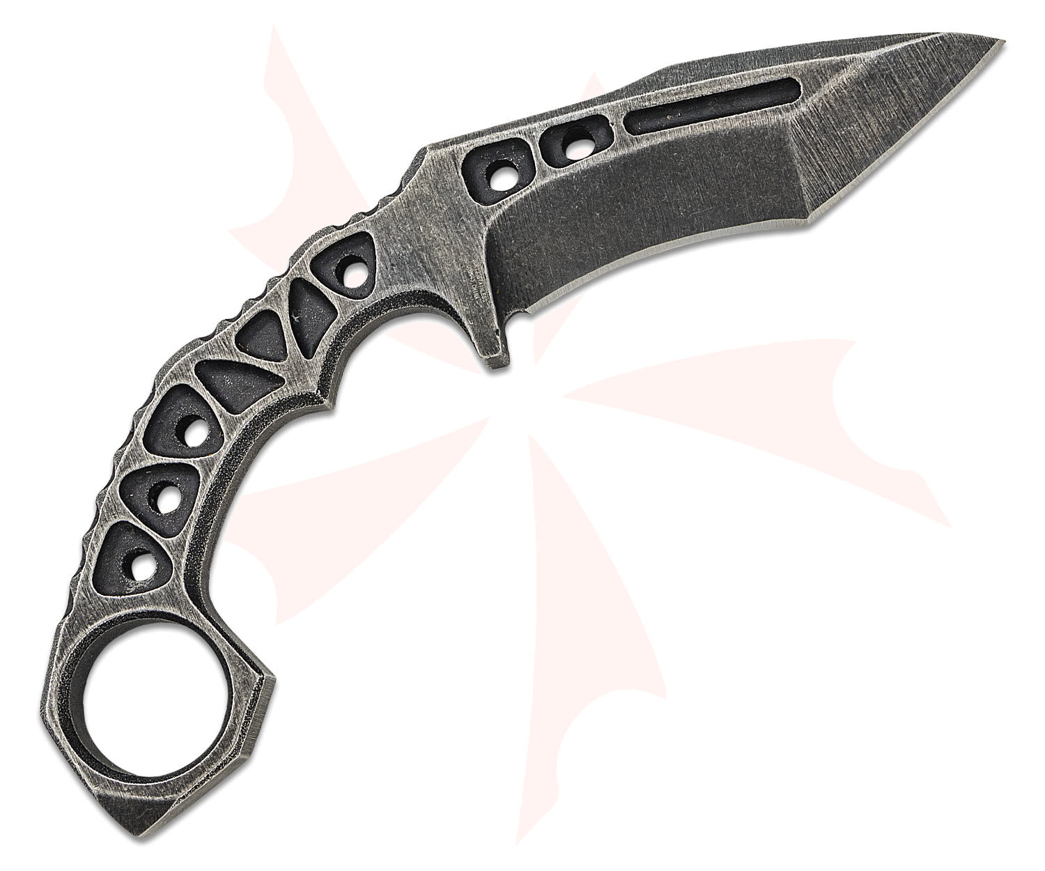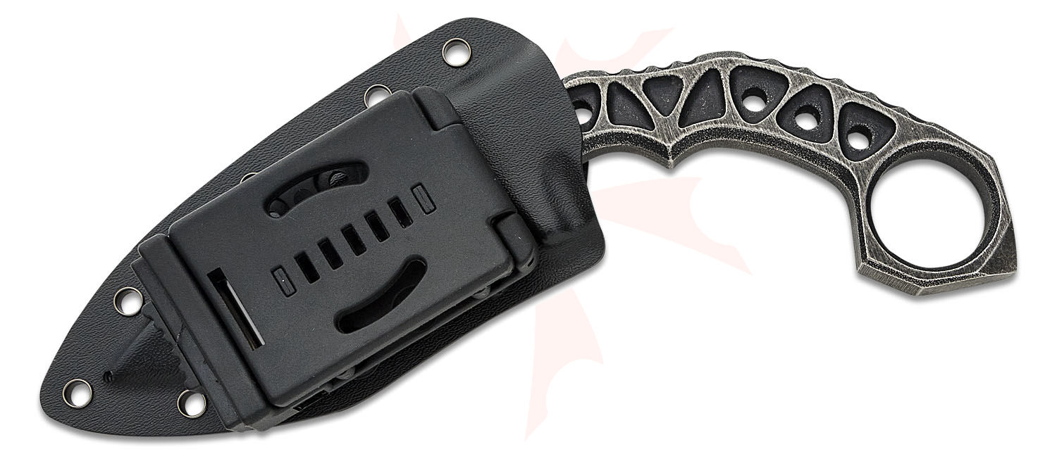 The M48 Tanker Combat Karambit is a modernized design of the karambit, a weapon with hundreds of years of fighting history behind it. The large karambit is a one-piece 3Cr13 stainless steel construction with a black stonewashed finish and weight-reducing thru-holes. It has a 4.5" curved blade that's unbelievably sharp and the curved open-ring handle is very grippy with a grooved back. The karambit is 9.5" in overall length and can be conveniently carried and stored in a tough Kydex sheath with a boot clip.