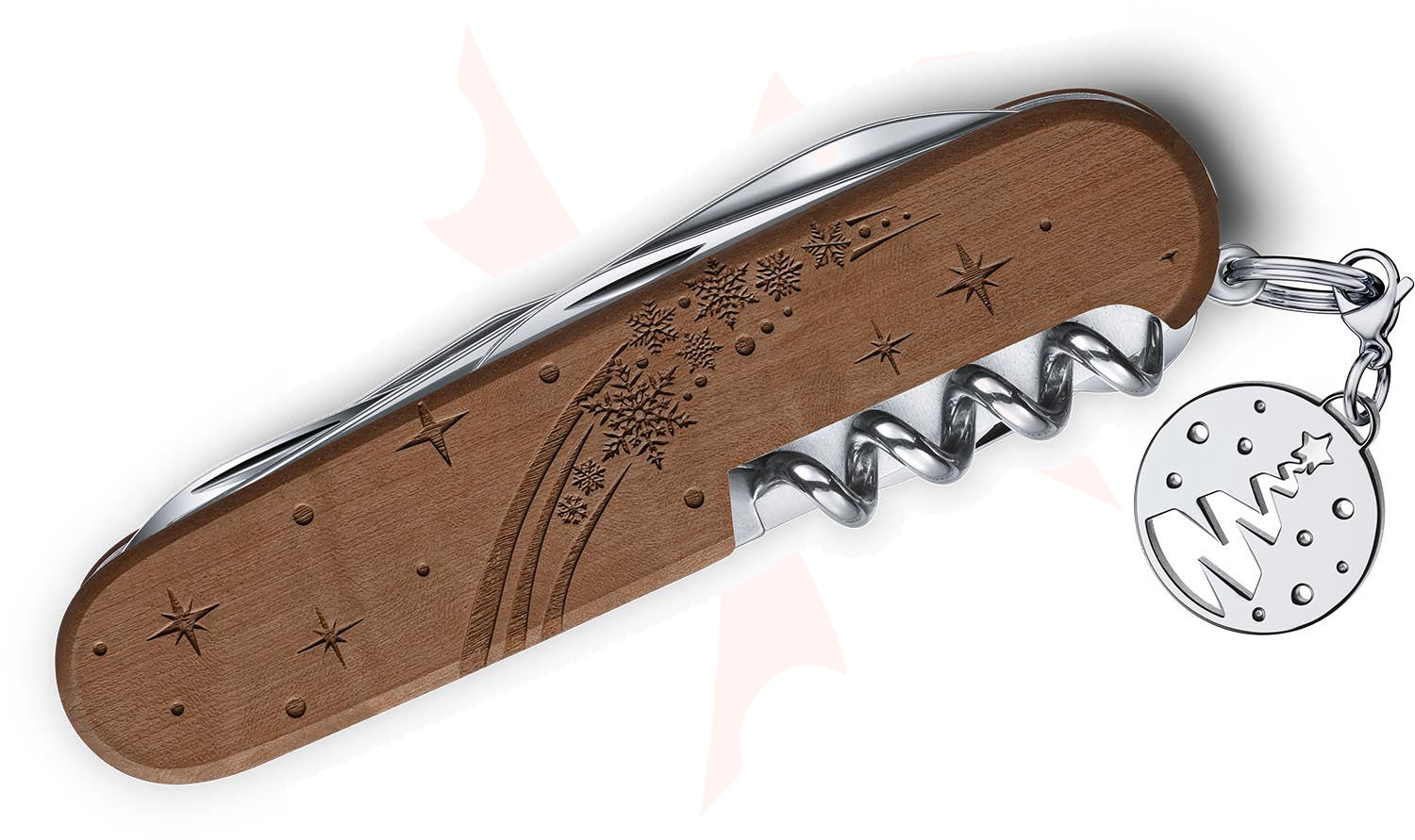 Limited to just 10,000 pieces worldwide, the Winter Magic 2025 Climber features beautiful pear wood scales engraved with an intricate laser-cut design. It skillfully packs twelve essential functions, including large and small blades, scissors, a corkscrew, and a multi-purpose hook. The design is completed with a detachable, coordinating charm, enhancing its originality as a true collector's item. This special edition offers genuine functionality in a collectible package, all crafted with trusted Swiss precision.