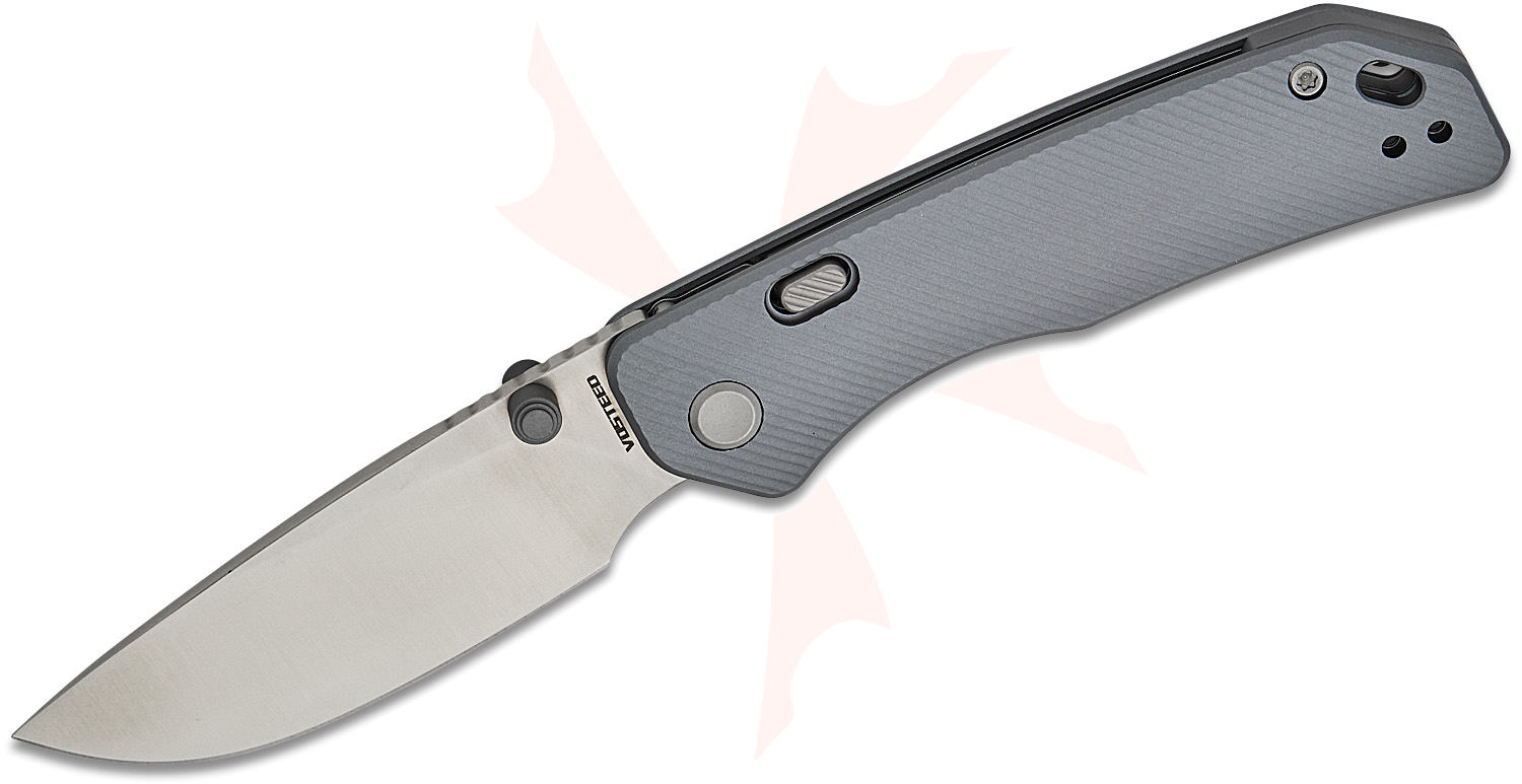 Vosteed Knives Marten Button Lock Folding Knife 2.98" 154CM Satin Drop Point Blade, Gray Aluminum Handles - A1601