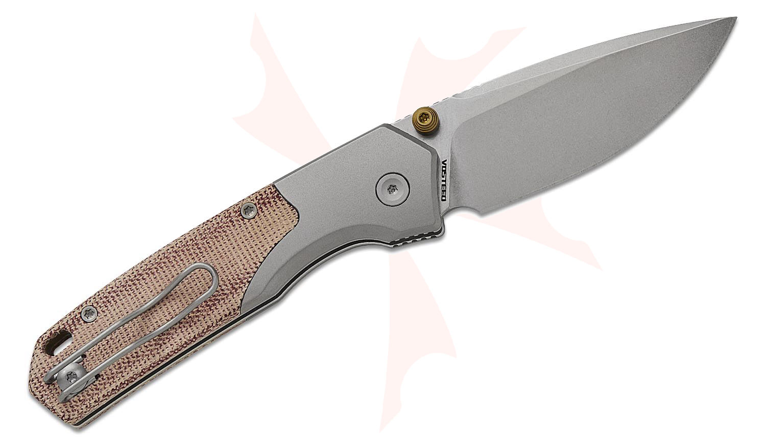 Vosteed Knives TuffKnives Psyop 299 Top Liner Lock Folding Knife 2.99" S35VN Stonewashed Drop Point Blade, Red Norplex UltreX Micarta Handles with Titanium Bolsters, Button Lock - A2217