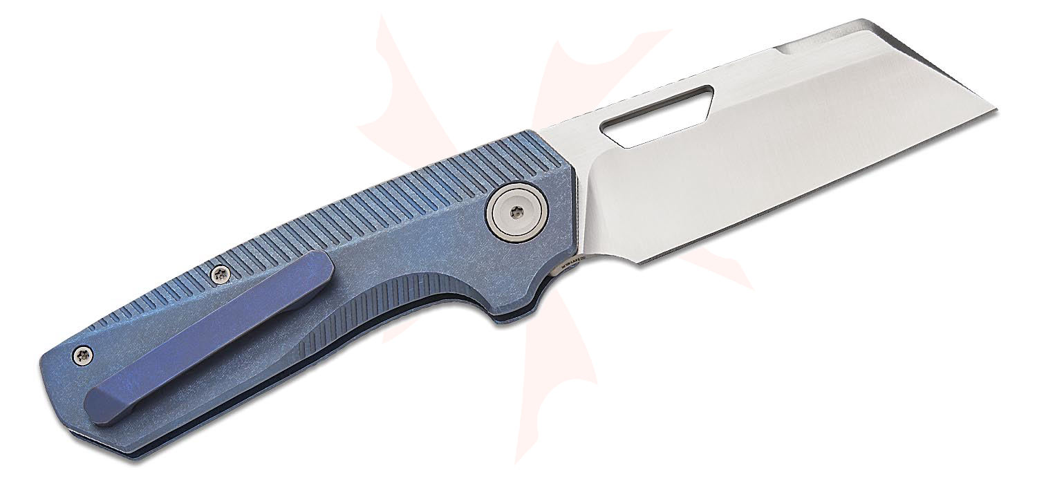 Vosteed Knives Divo Nip-L Top Liner Lock Folding Knife 3.15" Elmax Satin & Brushed Modified Sheepsfoot Blade, Blue Machined Titanium Handles, Button Lock - A4202