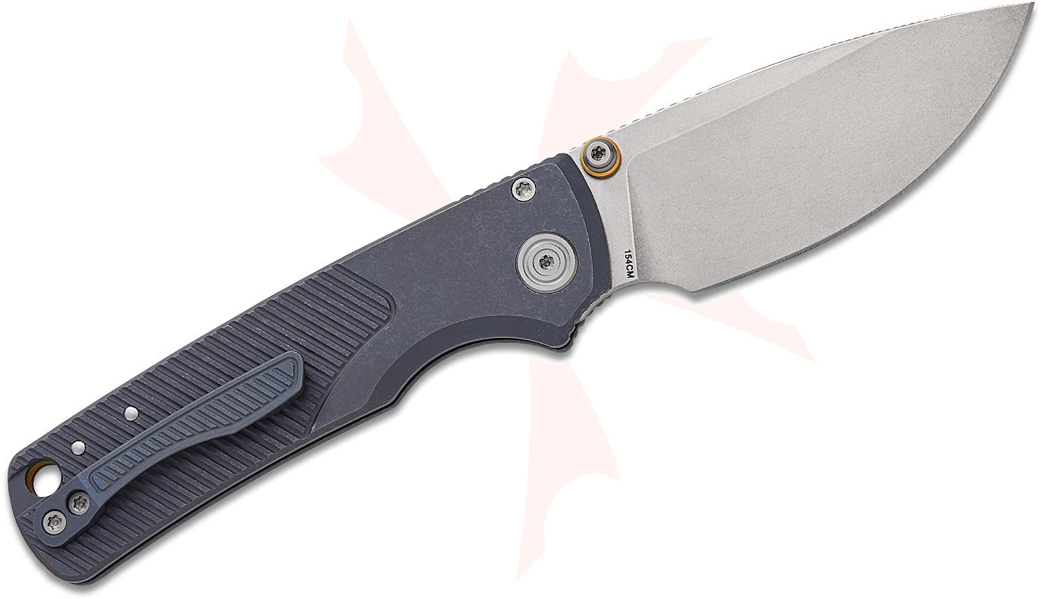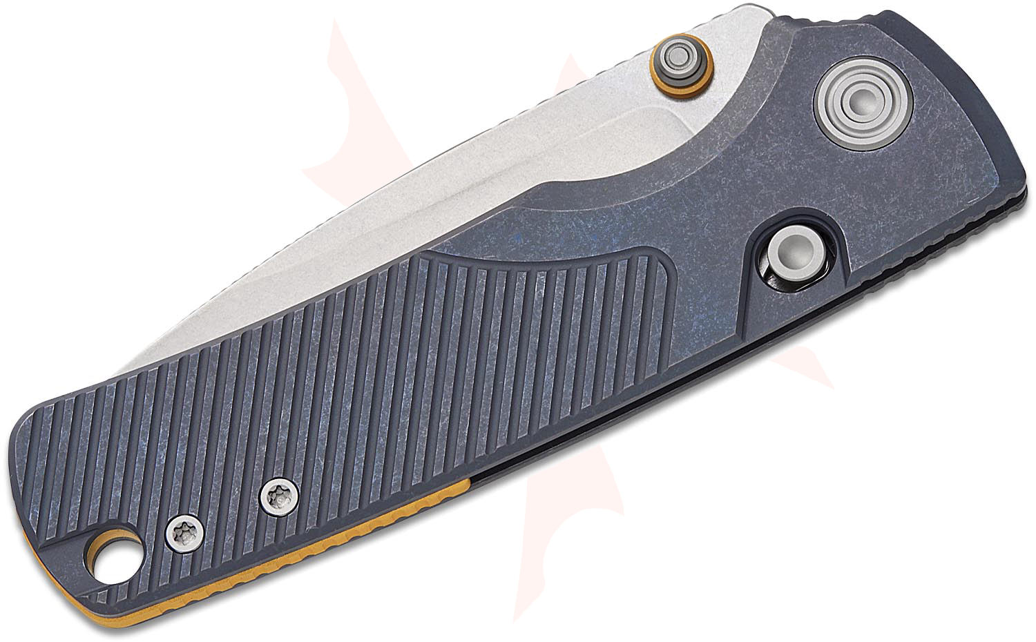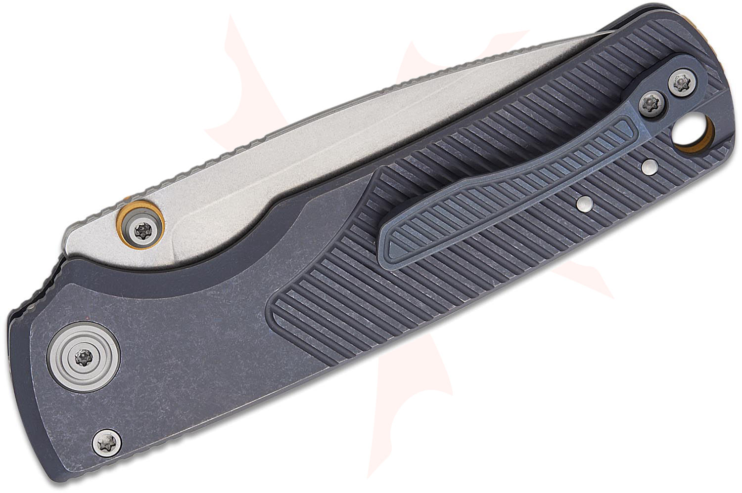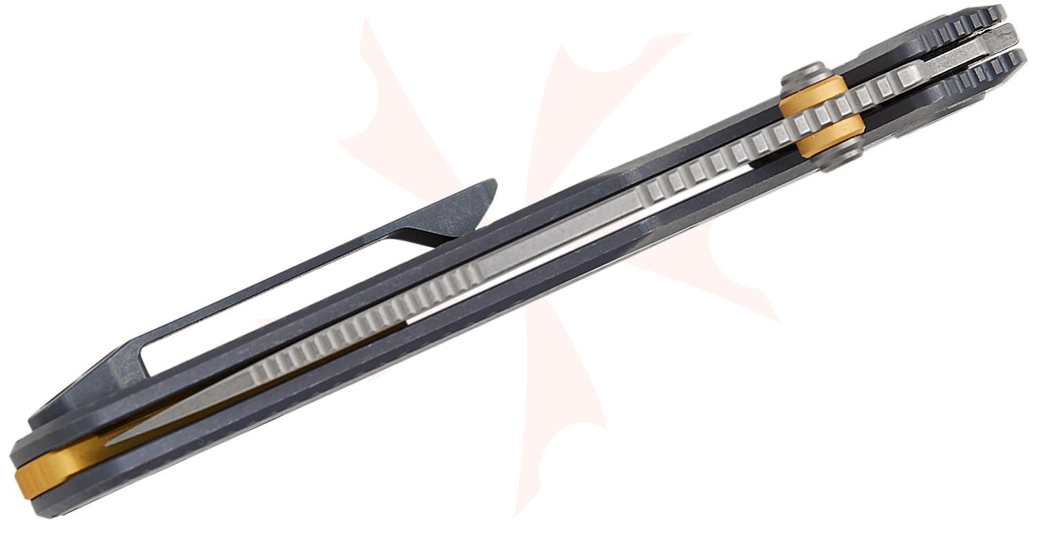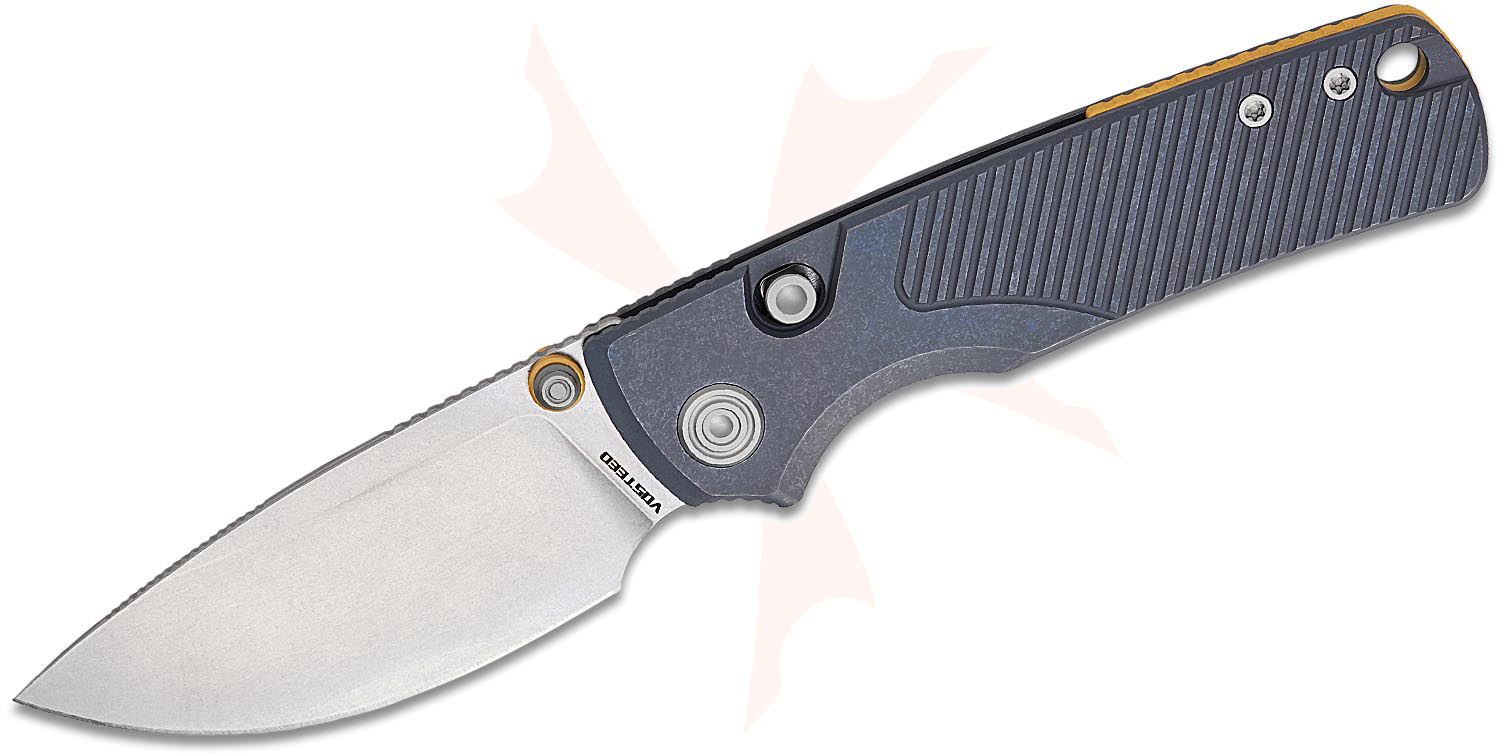 Vosteed Knives Yue Porcupine TiSlim Top Liner Lock Folding Knife 3.04" 154CM Stonewashed Drop Point Blade, Blue Machined Titanium Handles, Button Lock - A4803