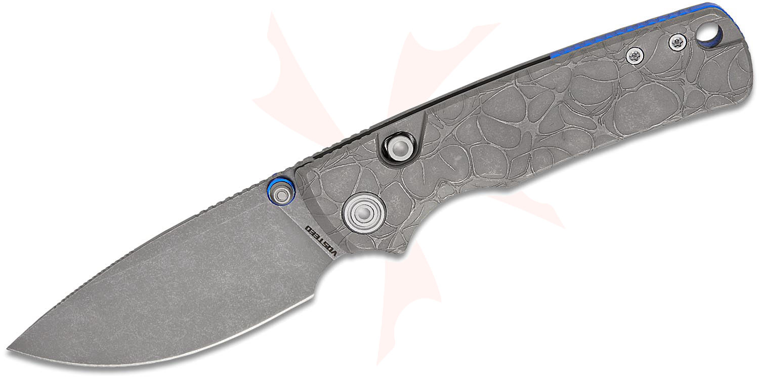 Vosteed Knives Yue Porcupine TiSlim Top Liner Lock Folding Knife 3.04" S90V Acid Washed Drop Point Blade, Acid Wash Gray Machined Titanium Handles, Button Lock - A4805