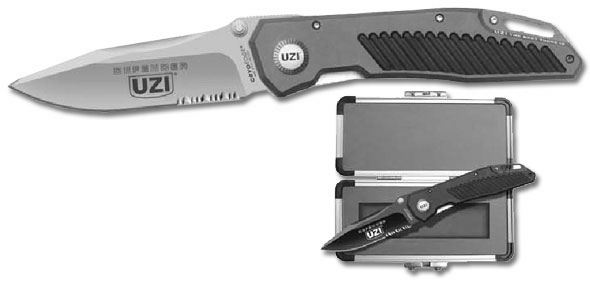 AS PICTURED BUT WITH A PLAIN EDGE AND BLACK ANODIZED HANDLE Uzi Defender Knife Bead-Blast Finish Plain Edged Blade, Black Aluminum Handle Designed by Fred Carter who has over 25 years of experience in custom knifemaking and design, has won numerous knife awards, and is highly regarded in the knife industry as an expert. All of his folding knife designs are built using the highest quality precision engineered and CNC machined parts. The new Uzi knife line features a 6061-T6 aircraft aluminum handle, a recessed liner spring for a slim profile, stainless steel screws, and a stainless steel pocket clip. The AUS-8 stainless steel blade features full heat treatment, plus CryoEdge�, a cryogenic tempering process at -300� F for a superior edge life. Each Knife has an aluminum storage case. Made in USA Closed Length: 4-1/4" Blade Length: 3-1/8" Blade Thickness: 3/32" Blade Material: AUS-8 stainless steel. Handle Material: 6061-T6 aircraft aluminum with textured rubbery inserts