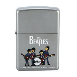 Satin chrome finished lighter with color cartoon pictures of The Beatles playing.